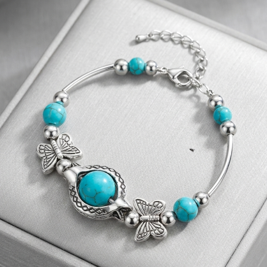 Trendy Turquoise Decor Charm Bracelet, Vintage Style Handmade Bracelet With Simple Lucky Bead Butterfly Charm Bracelet
