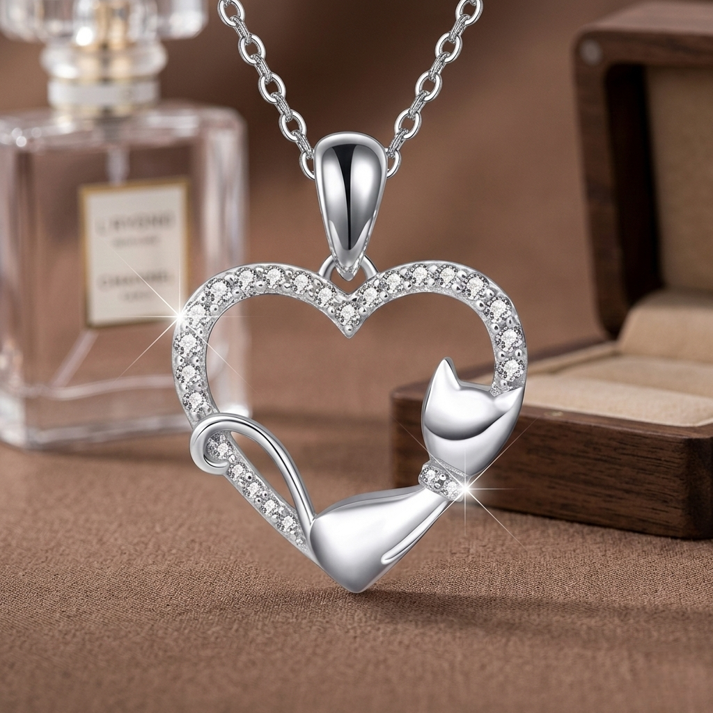 Cat-Shaped Interlocking Hearts Pendant Necklace – Cute Kitty Jewelry Gift for Cat Lovers, Birthday & Christmas Present, Casual Attire