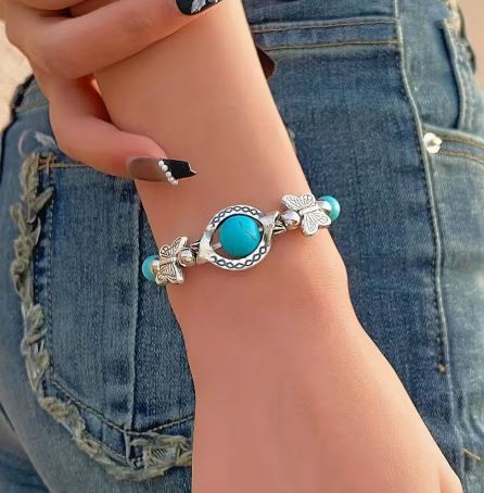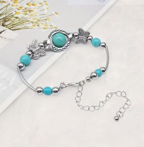 Trendy Turquoise Decor Charm Bracelet, Vintage Style Handmade Bracelet With Simple Lucky Bead Butterfly Charm Bracelet