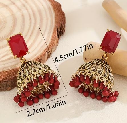 A Pair of Vintage Jhumka Earrings with Charming Glass Inlays And Tassels, Exquisite Accessories Suitable for Women to Wear on a Daily Basis, During Festivals, Weddings, And Parties.