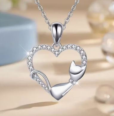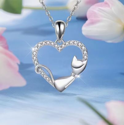 Cat-Shaped Interlocking Hearts Pendant Necklace - Cute Kitty Jewelry Gift for Cat Lovers, Birthday & Christmas Present, Casual Attire